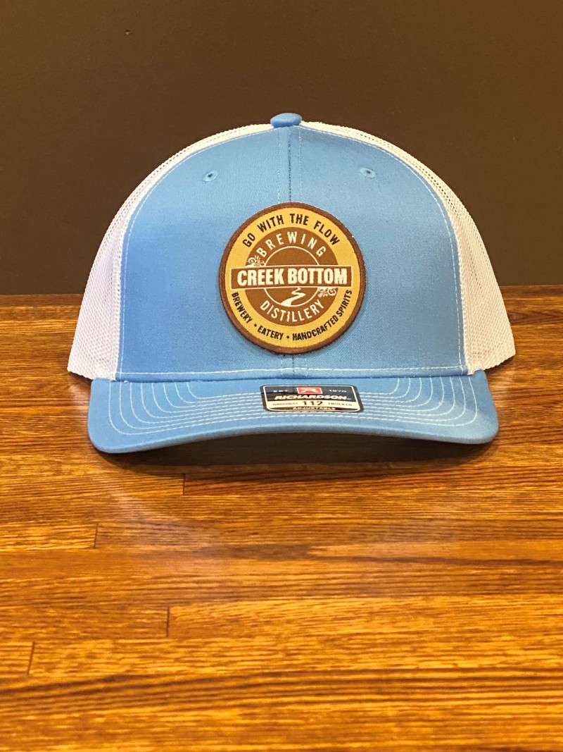Richardson 112 Style Trucker Hat in Columbia Blue with Creek Bottom Brewing Company logo patch.
